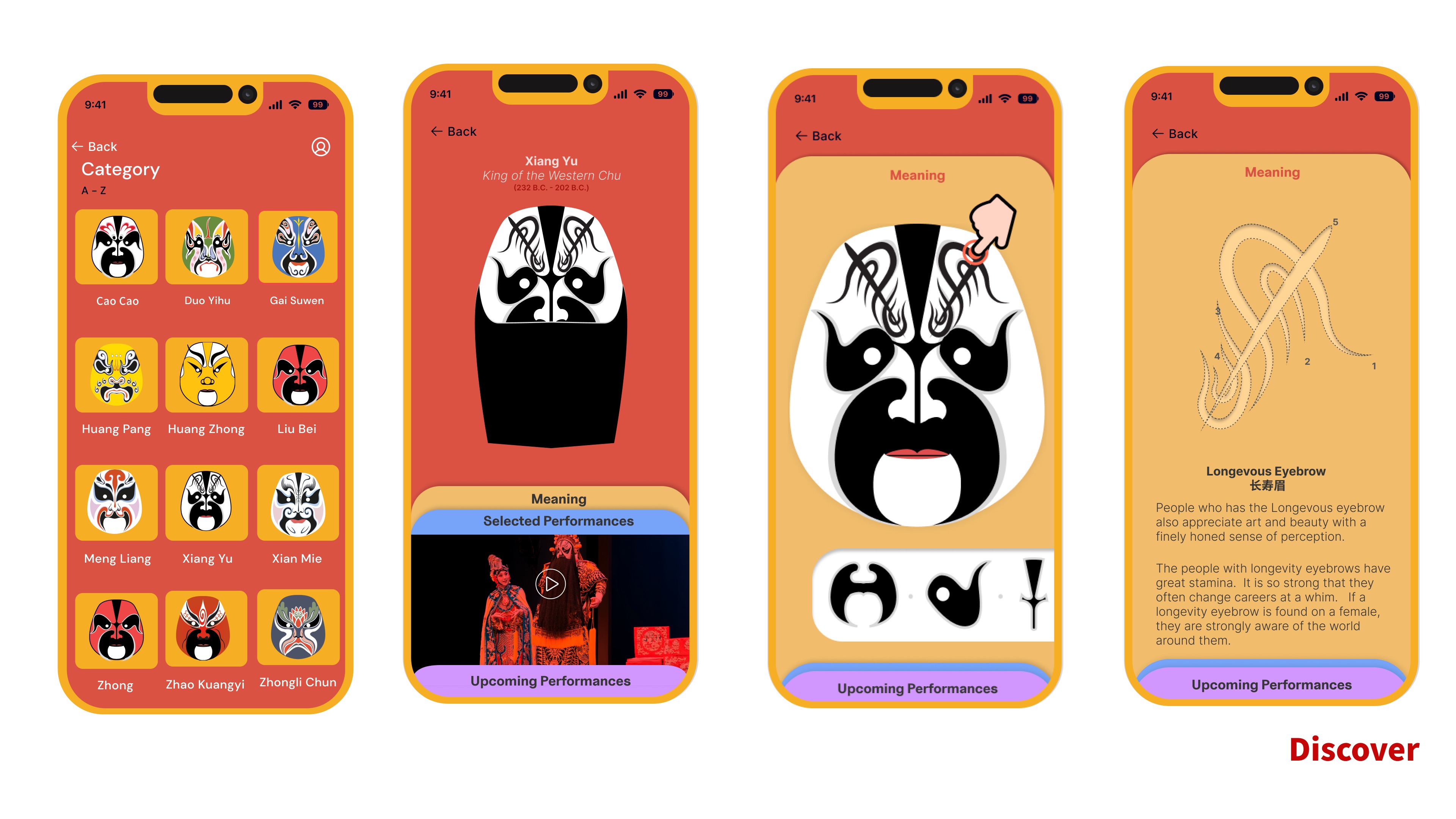 I want to take the two features of Peking Opera masks which it shows the the basic predisposition of a particular character/mask; and it achieves the contradictory unity of beauty and ugliness to today’s avatar. And also allow users to create their masks according to their unique personalities and discover the rich history of the Peking opera.There are four sections: Discover, Create, Apply, and PekGo. Through the four function the app brings Peking opera to the present by telling the history, creating personalized masks, and giving the opportunity to discover the lesser-known culture of Peking opera performances.